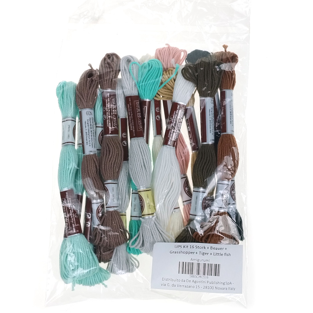 Amigurumi kit – DMC UPS yarns 16 Stork + Beaver + Grasshopper + Tiger + Mollusk.