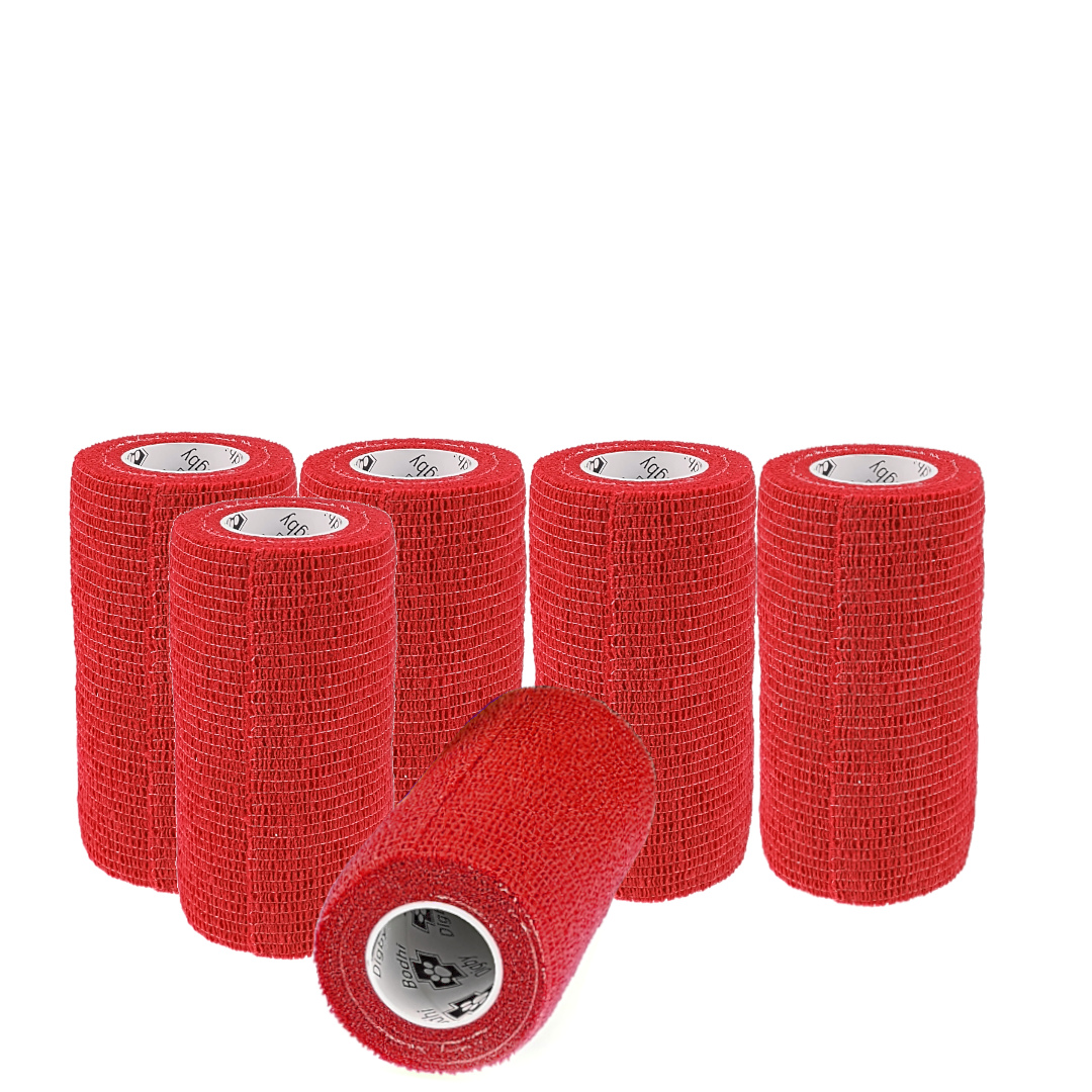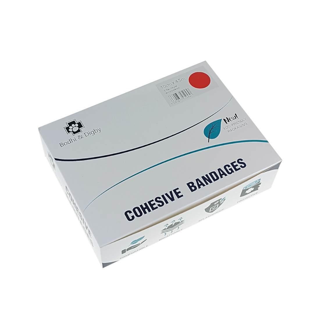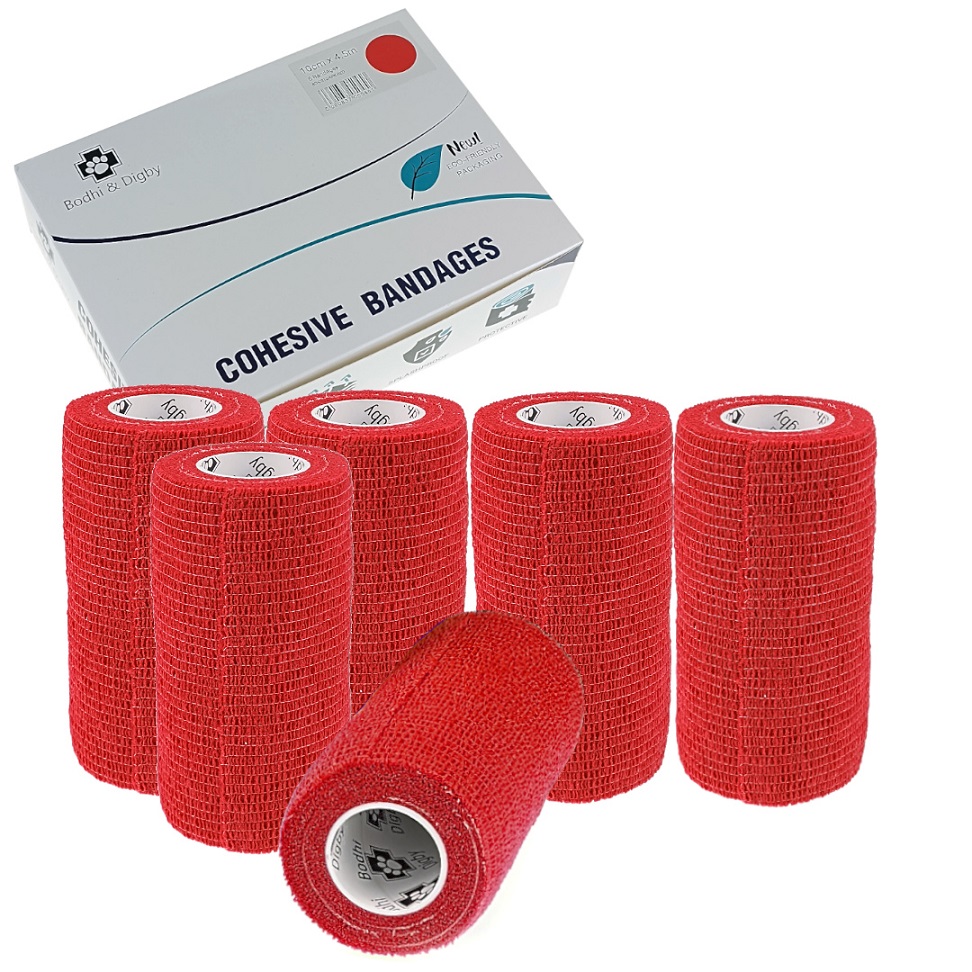Bodhi&Digby animal cohesive elastic bandage 10cm x 4.5m red. The bandage sticks to itself, not to the animal’s skin, hair or fur. Bandages are ideal for all kinds of applications where you don’t want messy, hard-to-remove adhesives. They are easy to remove without sticking to hair or animal hair. Our bandages are suitable for many circumstances. You can add them to your horse kit, pet or human first aid kit, gym bag or first aid kit. Bandages packaged in foil. Packaging: carton of 6 pieces.