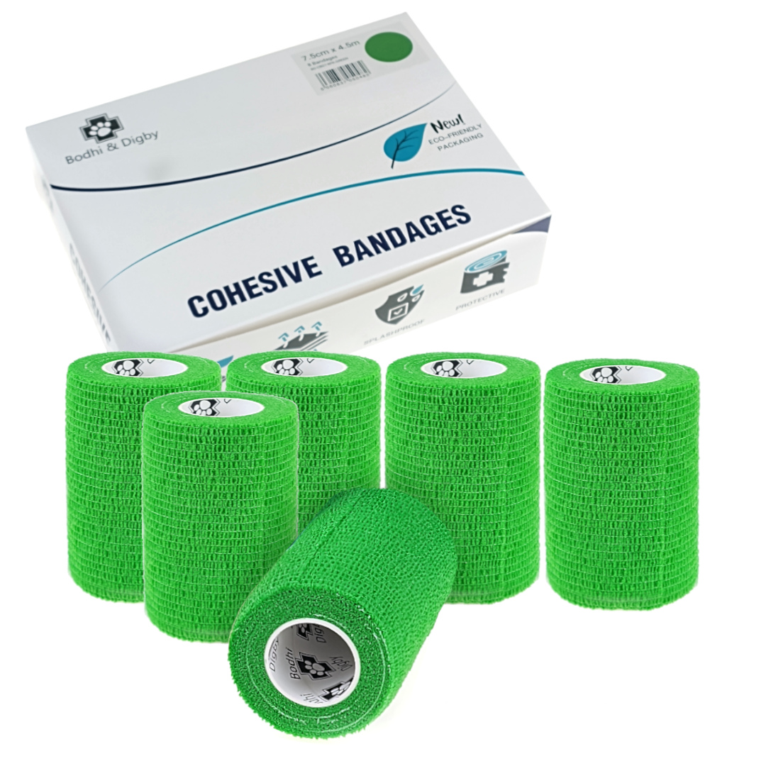 Bandaż elastyczny kohezyjny dla zwierząt Bodhi&Digby 7,5cm x 4,5m zielony. Bandaż przykleja się do siebie, nie do skóry, włosów ani sierści zwierząt. Bandaże są idealne do wszelkiego rodzaju zastosowań, w których nie chcesz mieć brudzących, trudnych do usunięcia klejów. Łatwo je usunąć, bez przyklejania się do włosów lub sierści zwierząt. Nasze bandaże są dostosowane do wielu okoliczności. Możesz dodać je do zestawu dla konia, apteczki dla zwierząt lub ludzi, torby na siłownię lub zestawu pierwszej pomocy. Bandaże zapakowane w folię. Opakowanie: karton 8 sztuk.