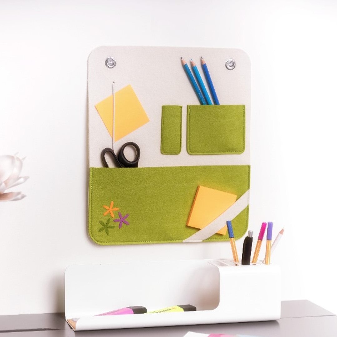 Praktyczny organizer ścienny wykonany z filcu, przeznaczony do przechowywania drobnych akcesoriów biurowych i domowych.