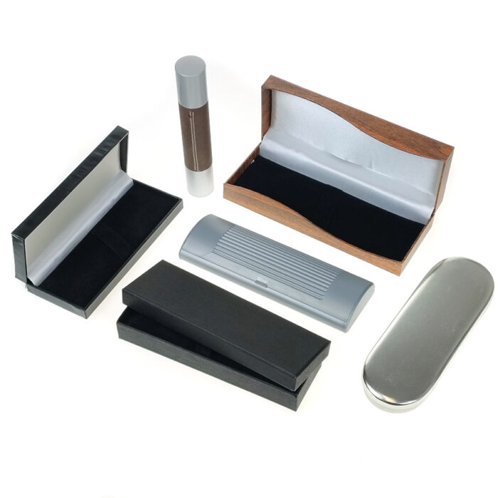 Pudełka na długopisy MIX wzorów. Zestaw różnorodnych pudełek na długopisy – od klasycznej czerni po fakturę drewna i metalu. Opakowanie: luz. Cena za sztukę.