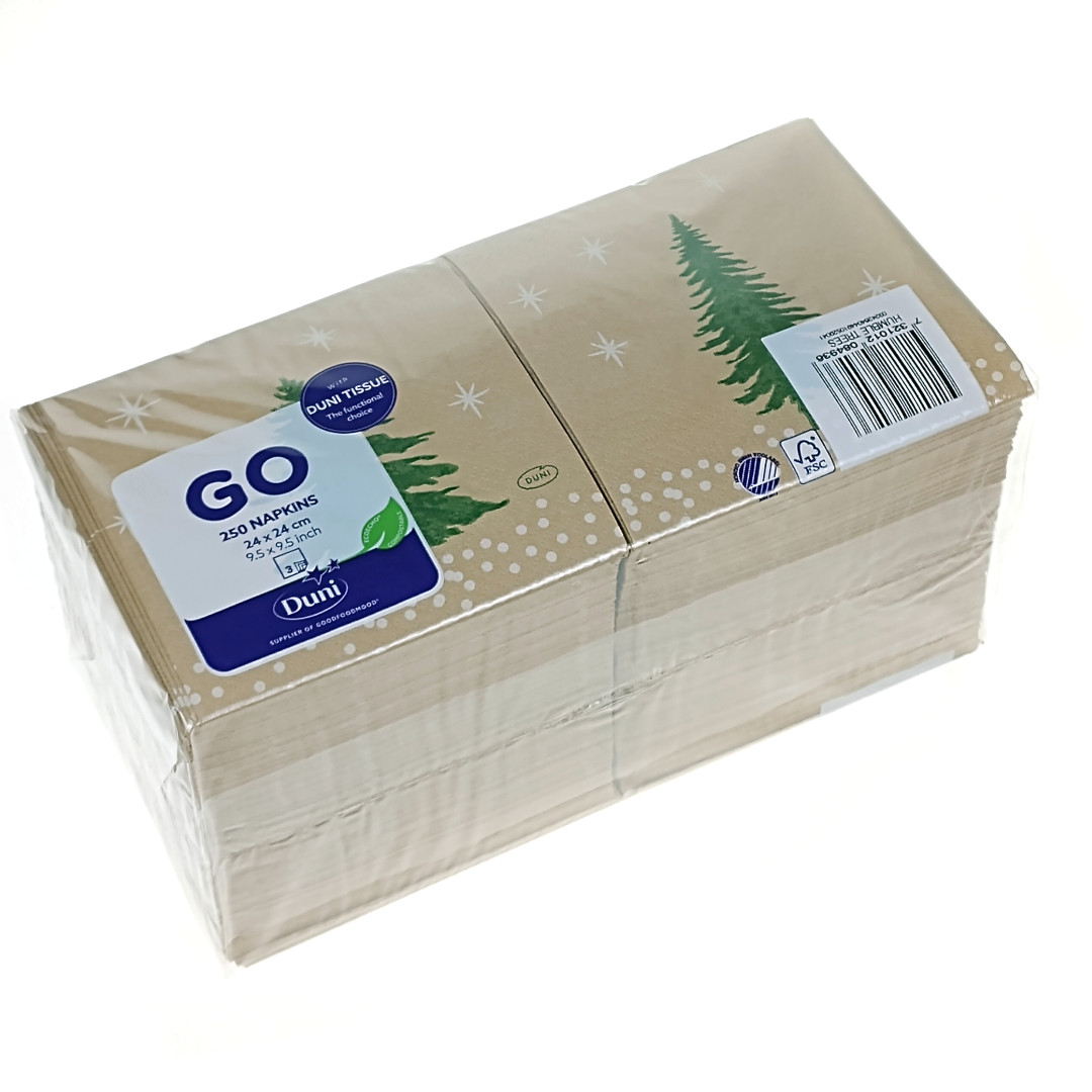 Serwetki papierowe 3-W 24×24 cm HUMBLE TREES 250 szt. w opakowaniu. Doskonałe do wykorzystania w gastronomii jak i do użytku domowego. Serwetki zapakowane w folię oraz karton zbiorczy. Karton zbiorczy jest praktycznym displayem, który ułatwia ekspozycję oraz dystrybucję serwetek (zdjęcie przykładowe). Serwetki papierowe są wykonane z papieru z certyfikatem FSC, co zapewnia, że materiał użyty do ich produkcji pochodzi z dobrze zarządzanych lasów, które zapewniają korzyści środowiskowe, społeczne i ekonomiczne. Ilość op. w opakowaniu zbiorczym: 8 szt.